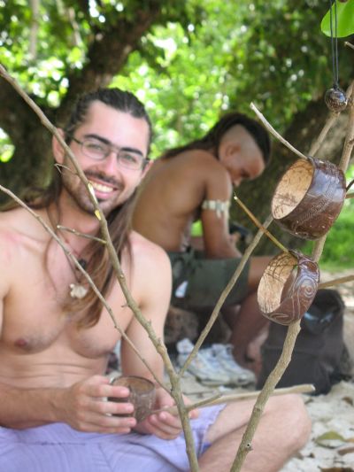 באחד מהימים הראשונים לחונכות, הגיתי רעיון ליצור פאוץ’ שיתלבש על החגורה מאגוז הקוקוס, ציט’ה מיד נרתם למשימה וסיפר שיש עץ אחד שהוא בעל הקוקוסים הכי גדולים באי.