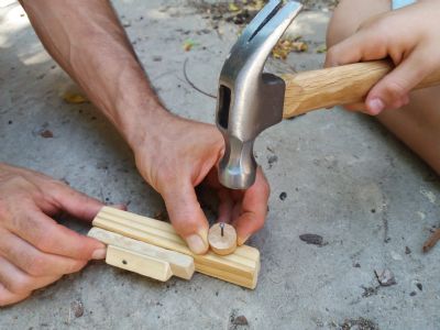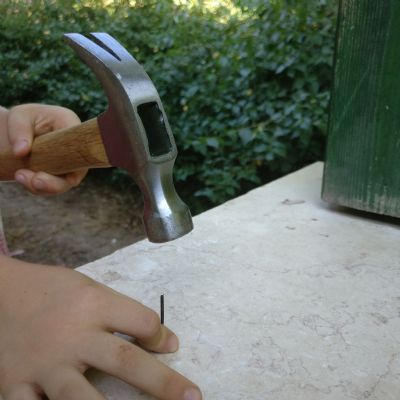 הניחו את החוד המעוך של המסמר על גבי החלק שאתם עומדים לחבר, קחו טווח ביטחון של כ 1.5 ס”מ מקצה חתיכת העץ למניעת הפיצול והחדירו את המסמר עד לסופו- בערך כשני מסמרים לכל חלק.